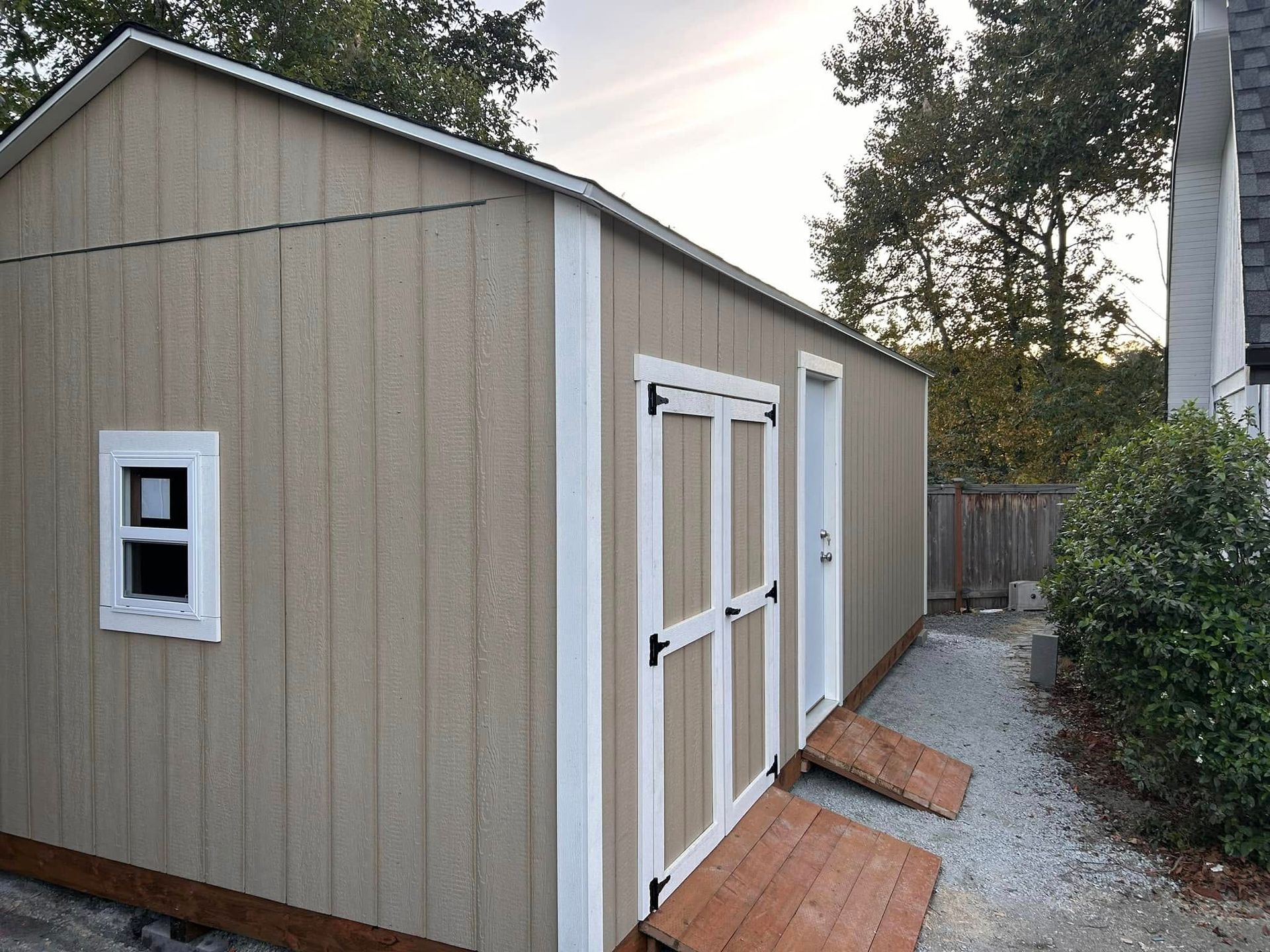 All sheds include on-site installation, leveling (up to 12”), and a five-year structural warranty against defective materials and workmanship.
